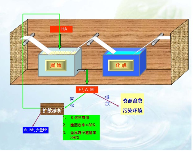 化成箔腐蝕加工過程中,產(chǎn)生大量的廢酸。這些廢酸的排放(即使采用石灰中和),不僅造成資源浪費,使產(chǎn)品成本增加,而且還導致嚴重的環(huán)境污染,影響和制約了企業(yè)的生存和發(fā)展。以一個中型的低壓電極箔生產(chǎn)企業(yè)為例,每天排放15—20%的廢鹽酸30噸,相當于浪費15—20噸31%的成品酸。采用擴散滲析技術(shù),可將其中的鹽酸有效回收,每月節(jié)約鹽酸產(chǎn)生的經(jīng)濟效益在20萬元以上,同時還解決了環(huán)境污染問題,經(jīng)濟效益和社會效益十分可。