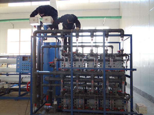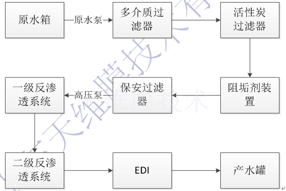 對比原水水質情況,工藝推薦選擇工藝成熟、操作方便、運行操作費用低的雙級反滲透+EDI的水處理系統。在運行過程中充分考慮到水的回用,二級反滲透濃水回到一級進水,EDI濃水與極水一起回到二級反滲透作為進水。